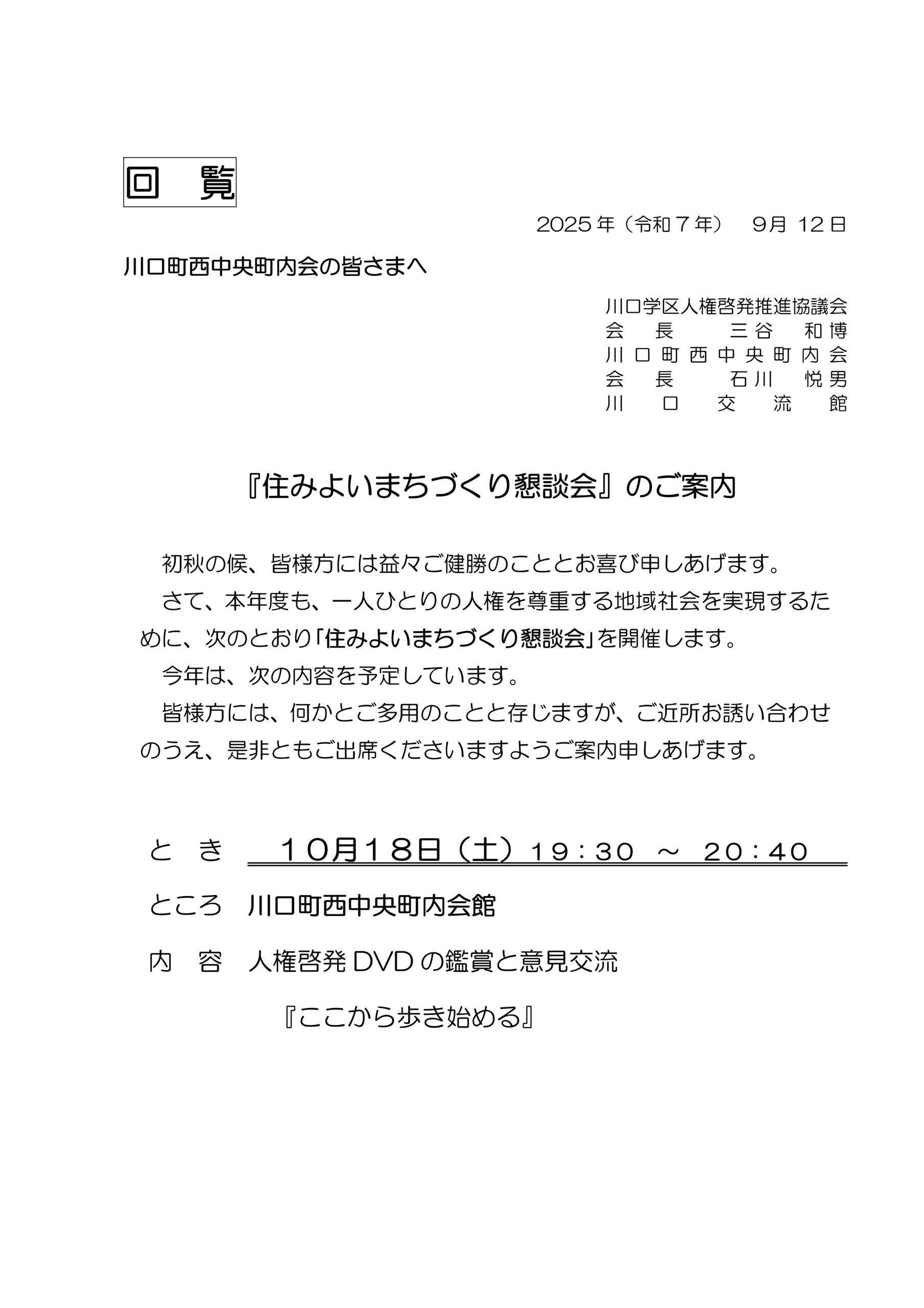 川口学区では、本年度も、一人ひとりの人権を尊重する社会を実現するために、各町内会の集会所で「住みよいまちづくり懇談会」を開催します。