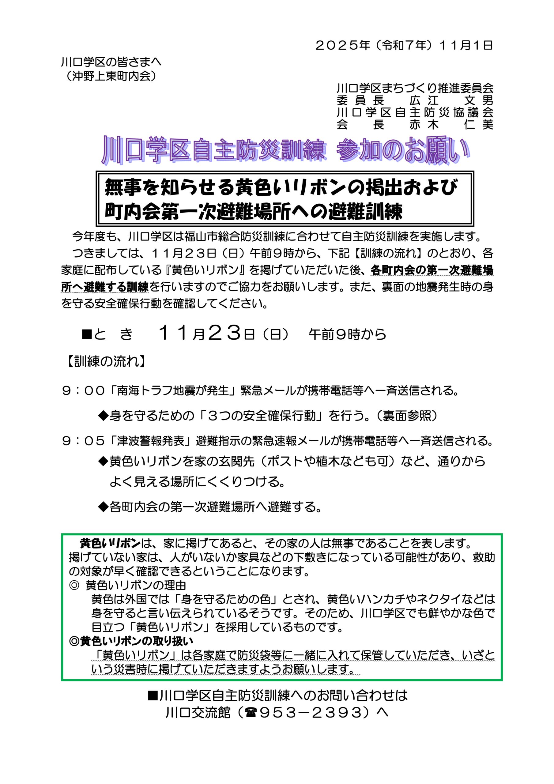 地震・津波を想定した福山市総合防災訓練に合わせて、川口学区では黄色いリボンの掲出訓練を実施します。