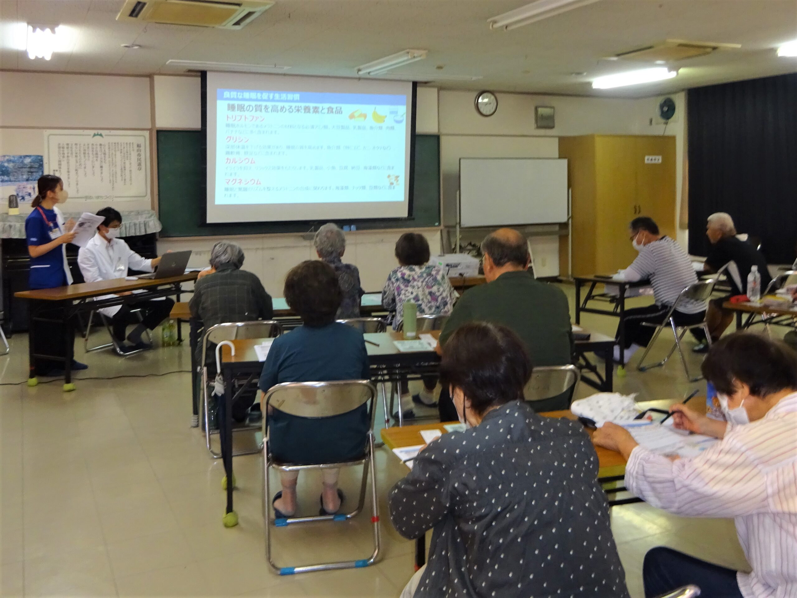8月27日、川口交流館で16人の地域住民が、ププレひまわり薬局多治米店の薬剤師と管理栄養士から、快適な睡眠習慣の作り方について、睡眠のメカニズムや運動・食事のポイントを学びました。