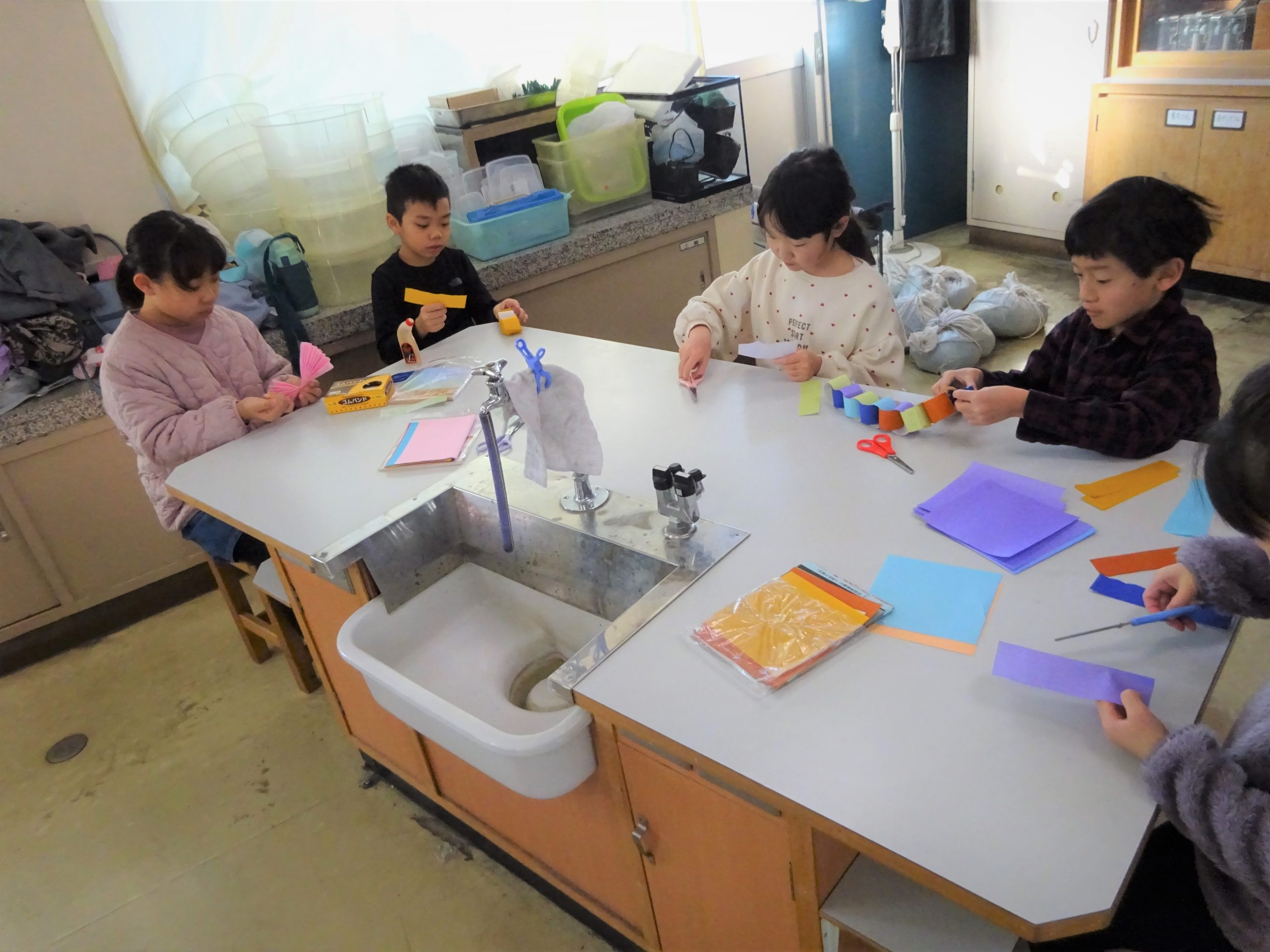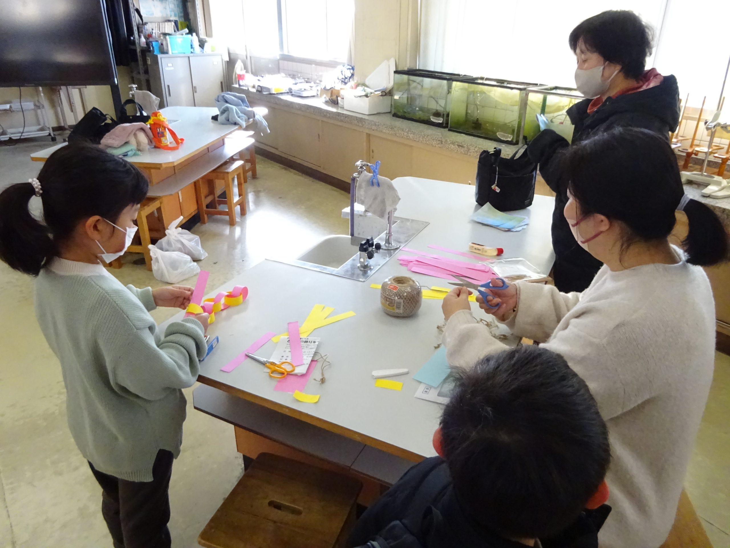 1月11日(土)に、川口小学校の理科室で児童7人とその家族が、とんどにつける飾りづくりをしました。