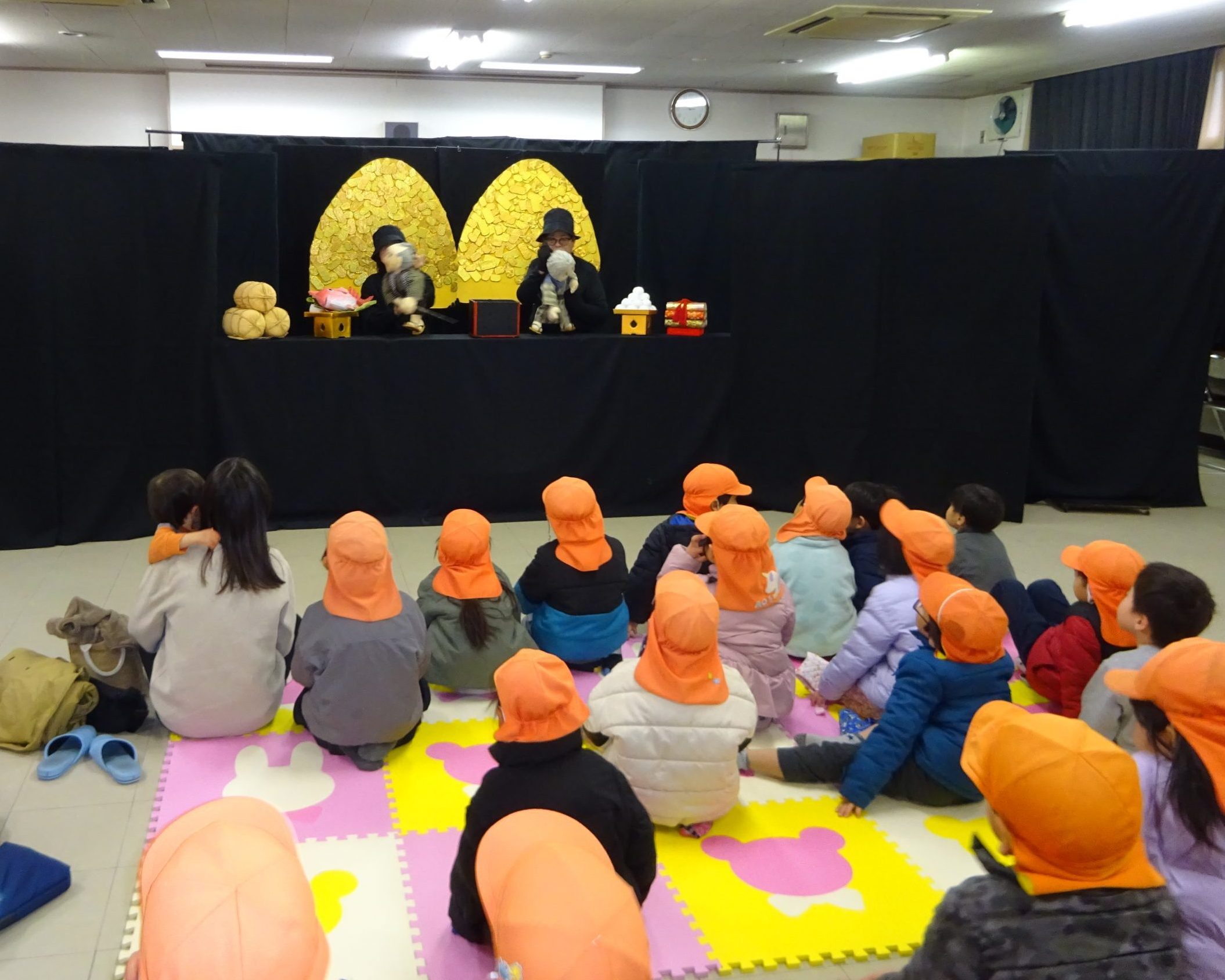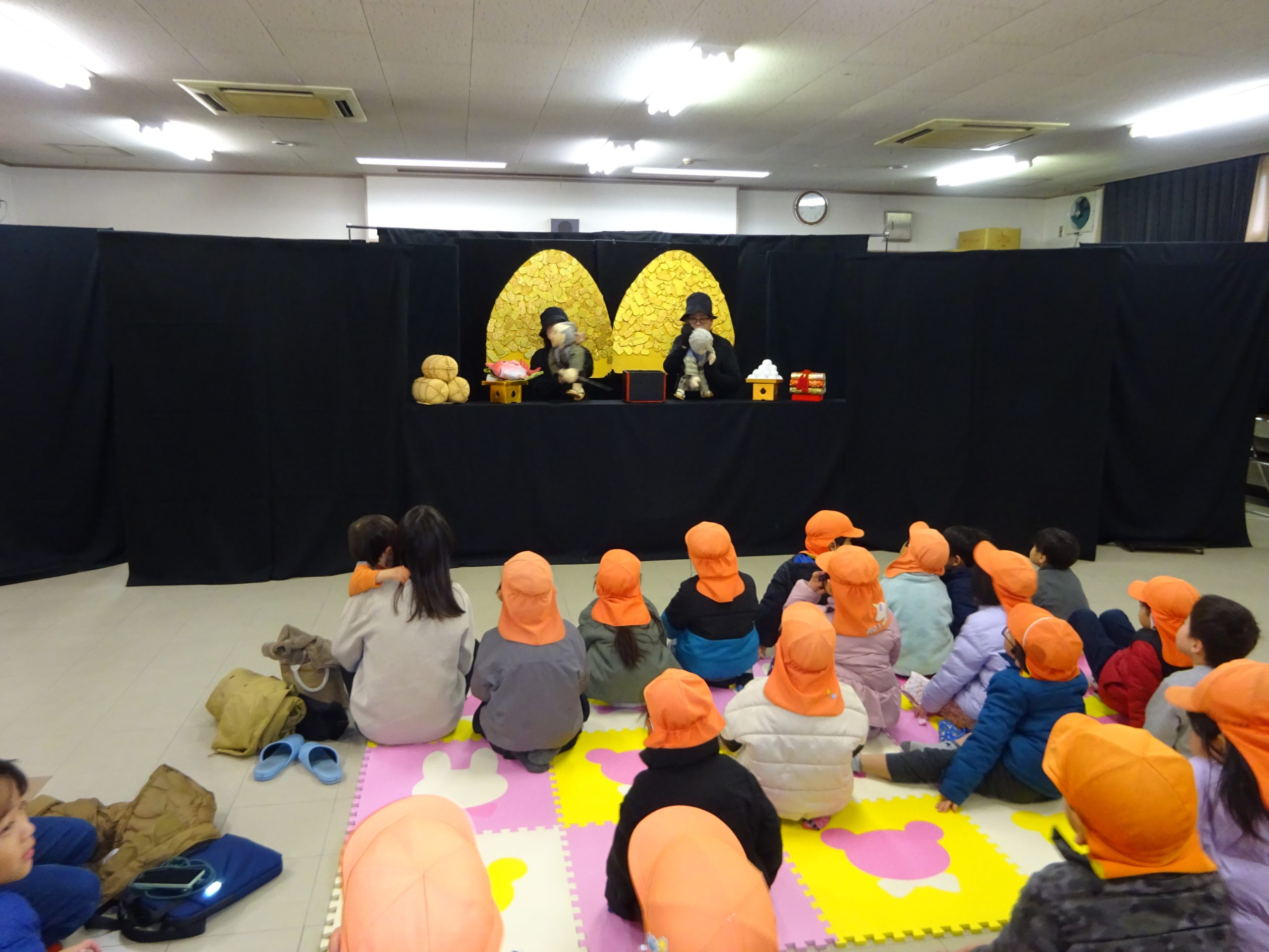 2月7日(金)に、川口交流館に福山おやこ劇場の「人形劇キャッツ」のみなさんを迎え、童話の「おむすびころりん」を鑑賞しました。