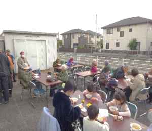 菅本副委員長のあいさつの後、熱々のかぼちゃ汁に、参加した方からは「冷えたからだに染み渡る」「甘くておいしいわ」と感想を言われ、当初の予定数を上回るほどの盛況ぶりに、調理の指導された田村副委員長は安堵されていました。
