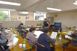川口ふれあいサロン9周年記念事業 〈共催 川口ふれあいサロン運営委員会〉 元川口幼稚園で毎週火曜日に開催している高齢者の集いの場「ふれあいサロン」に、講師の服部民江さんを迎え「脳トレ講座」を実施しました。 最初に、指を使い引き算の計算をし、その後、講師がそろばんの玉を動かし答え合わせをしました。 続いて、左右の腕を交互に伸ばす運動で、閉じた手のひらと広げた手のひらが混合する様子に「上手くできない方が脳が活性化されるので間違えることがいいんですよ」と話されました。